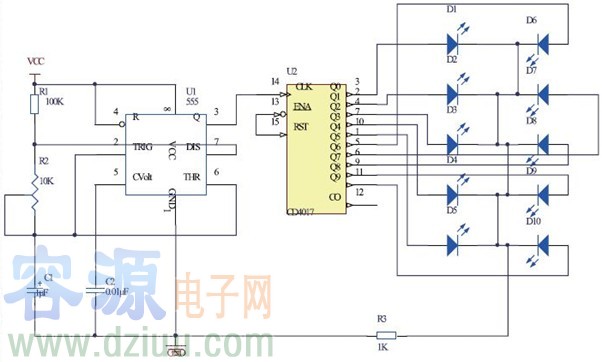 555定時器是一種模擬和數字功能相結合的集成器件,通過外圍元件的簡單組合,可以組成許多基本實用的電路,最基本且應用最多的有單穩態觸發器,施密特觸發器,多諧振蕩器三種。 本文今天帶來一款實用的LED流水