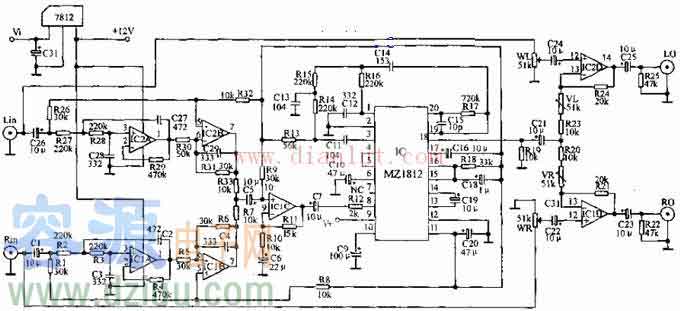 如圖所示電路主要由MZ1812設計而成,它是用于產生低音、超低音信號的專用集成電路。它將輸入的55-300Hz信號頻率降低一半(即27.5-150Hz)后輸出,亦即樂理上所謂的降低一個八度。電路首先對輸入的音頻信號作低通處