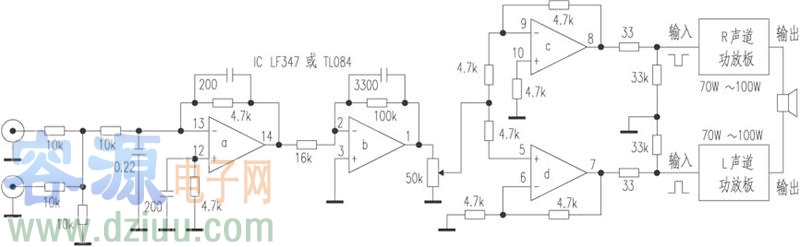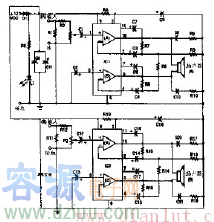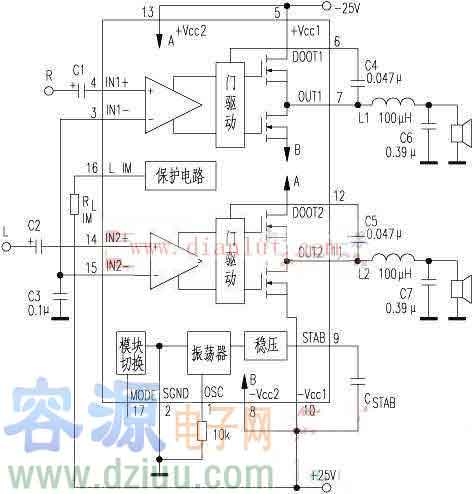 該20W+20W立體聲放大器由兩個完整而分立的20W RNS橋式放大器組成。輸入信號經過R1、R2和P1(電位器)構成的分壓網絡送入放大器。R1是信號源與地之間的負載阻抗,R2信號耦合到電位器P1。該信號由電容器C1到C2。