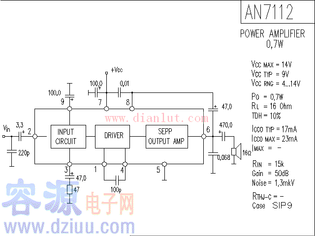 AN7112 是日本松下公司生產的音頻功率放大集成電路,多應用于3-5.5 英寸小型電視機及電腦音響系統中。 下面是采用AN7112的功放應用電路圖 :