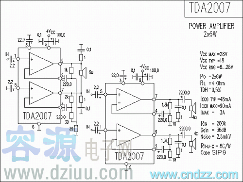 TDA2009是常見的高保真功放集成塊。額定功率為2×10W.電源電壓為8~28V。最大輸出電流為3.5A。具有過熱保護電路。(2×10W,THD=0.5%) 本電路采用該TDA2009所做的幾套功放來看,效果還是很不錯的,本電路地線
