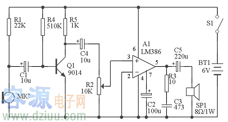 LM386是美國國家半導體公司生產的音頻功率放大器,主要應用于低電壓消費類產品.為使外圍元件最少,電壓增益內置為20.但在1腳和8腳之間增加一只外接電阻和電容,便可將電壓增益調為任意值,直至 200.輸入端以地位參考