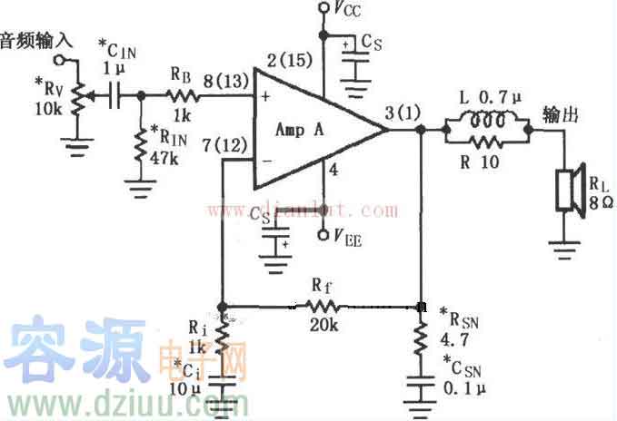 工作原理:音頻信號輸人后,經過Ci、Ri耦合加到放大器的反相輸入端(4腳),而放大器的同相輸入端(3腳)則交流接地,放大后的信號從5、8腳輸出。5、8腳之間接負載,如揚聲器,由此構成反相功率放大電路。為了避