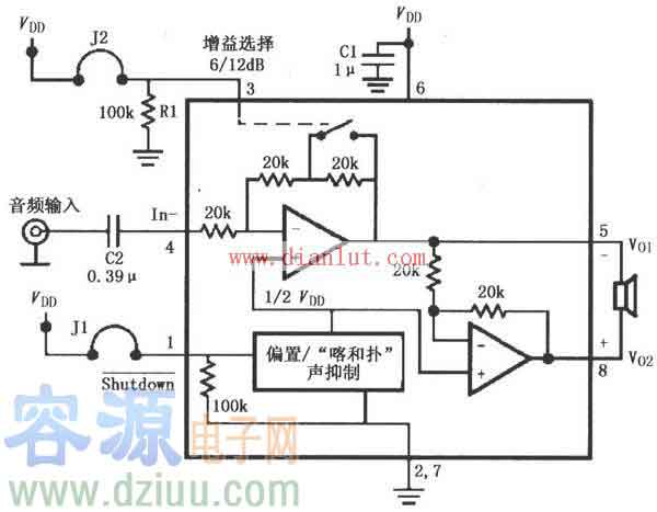 工作原理:只要增大R3即可提高放大器的增益。在R3兩端并聯電容C4,用于對高頻提供低阻通路濾波,防止高頻自激。J1為跳線,當J1接通時,1腳接地,全功率放大工作;當J1斷開時,1腳為VDD,微功耗關斷,放大器不工作