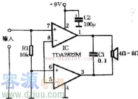 最簡單TDA2822功放電路圖:電路如圖所示。用一塊TDA2822M功放集成電路接成BTL方式,外圍元件只有一只電阻和兩只電容,不用裝散熱器,放音效果也令人滿意的。 集成電路TDA2822M為8腳雙列直插式封裝,R1的數值要求不拘,一般選用10k的碳